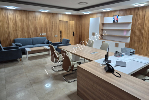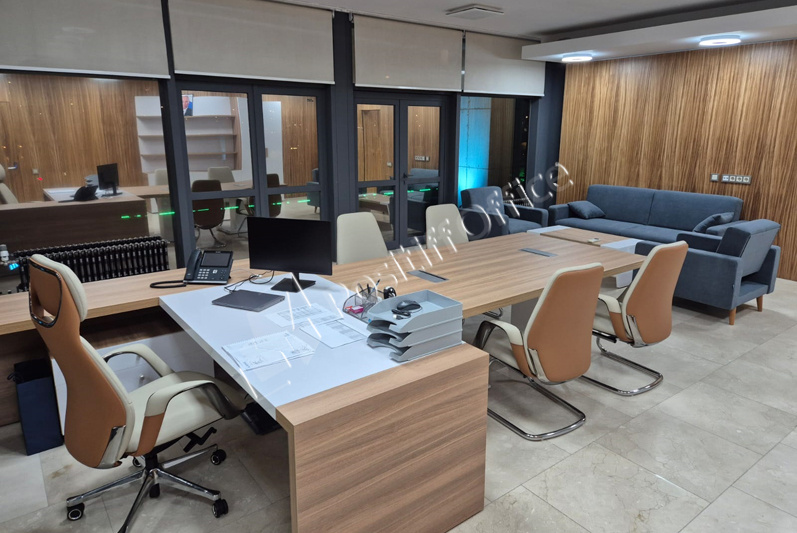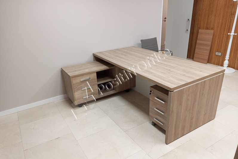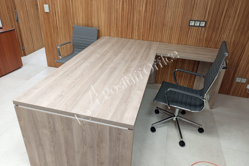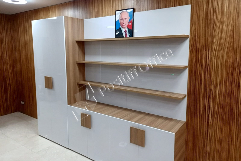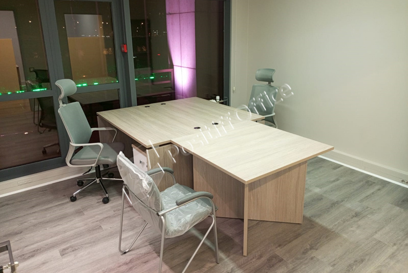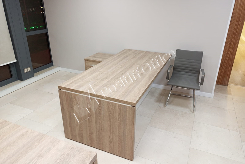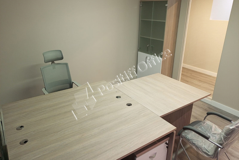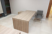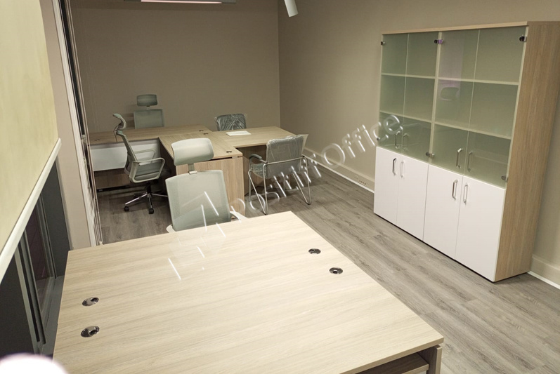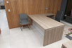 В выборе оттенка отталкивались от стеновых панелей в кабинете руководителя – отлично подошел кабинет KYU DM: древесная текстура цвета Дуб Честерфилд перекликается с оттенком стеновых панелей, а белый глянец вносит свою изюминку и делает кабинет легким и современным.
