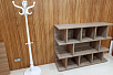 Открытые стеллажи с необычной геометрией полок цепляет взгляд и делает пространство уникальным.