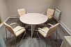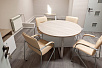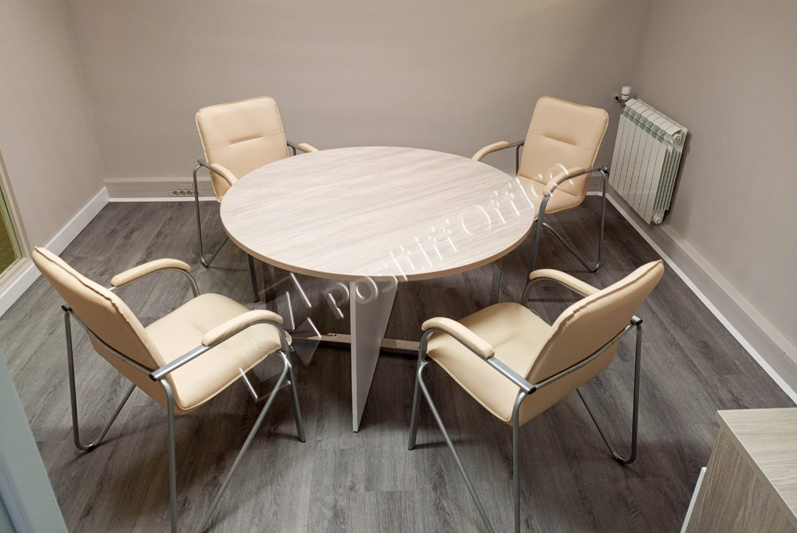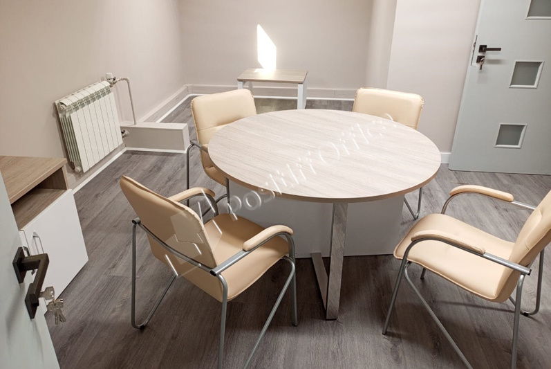В маленькие переговорные нужен был небольшой стол, но не простой, а с изюминкой. Прекрасно подошел круглый переговорный стол коллекции Shift, где одна опора ЛДСП, а вторая хромированный металл, цвет столешницы нам сделали на заказ в цвет основной мебели.
