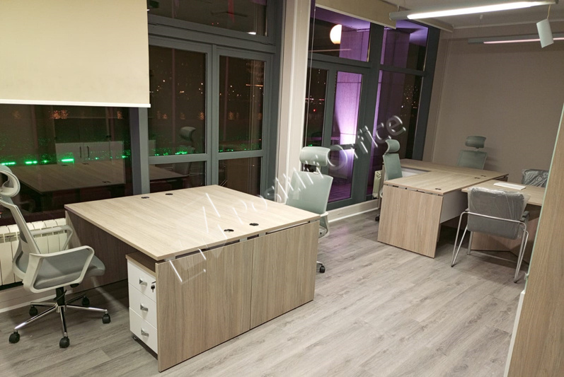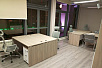 Сотрудникам поставили мебель ONIX, но на закрытых ЛДСП-опорах, в том же сочетании цветов.